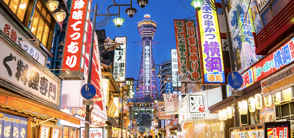 日本の台所として知られる大阪は、食文化とフレンドリーな雰囲気で有名な活気ある都市です。大阪城、道頓堀地区、そしてユニバーサル・スタジオ・ジャパンが特徴的です。