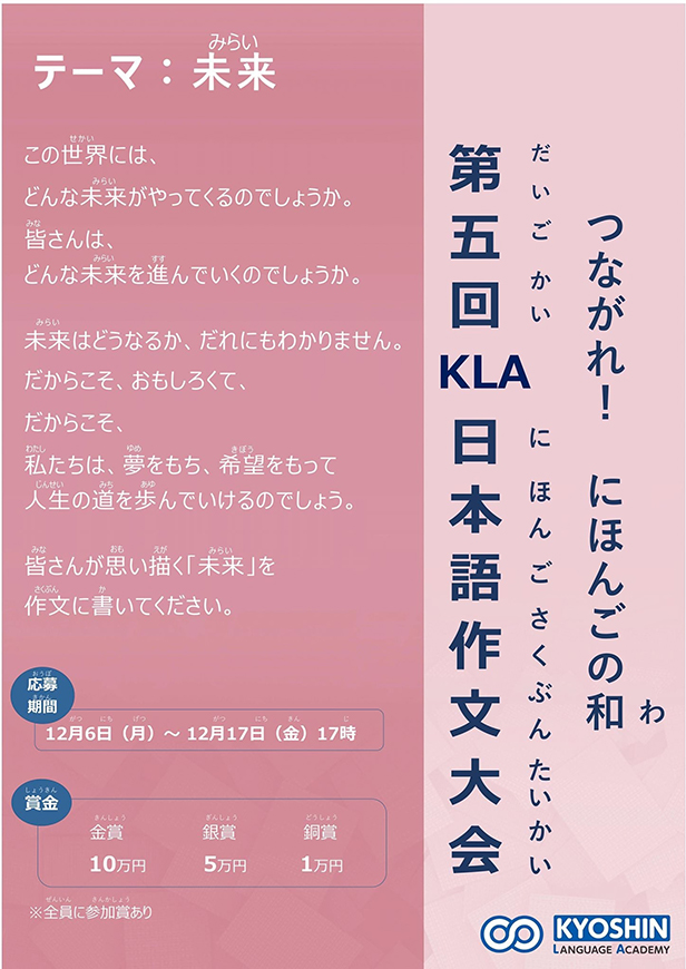 京進ランゲージアカデミーグループ(以下KLAグループ)では、毎年、国内外のグループ校に在籍する留学生を対象に日本語作文大会を開催しております。2021年度もKLA日本語作文大会が開催されました!